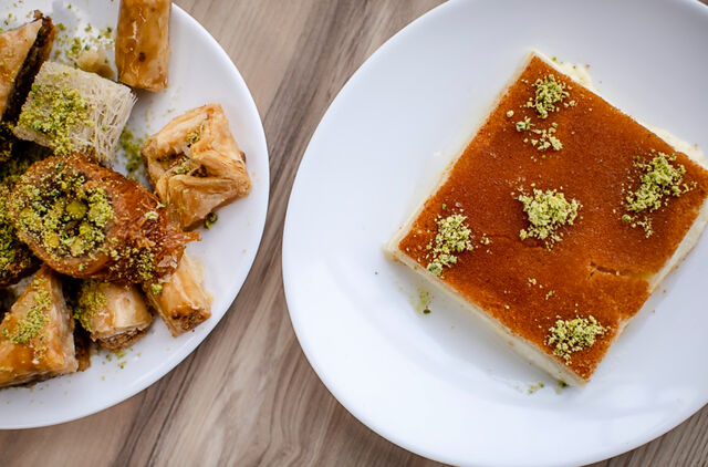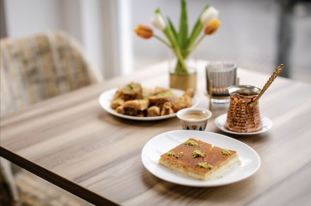 Genießen Sie Tabbouleh- und Fattoush-Salate, Hummus, Baba Ghanoush oder Kebbe-Dips, serviert mit Fladenbrot, gefüllten Weinblättern, Eintöpfen, gebratenen Fladen, Fleisch und Reisnudeln. Die Desserts sind mit zartem Rosen- und Orangenblütenwasser beträufelt, mit Honig und Gebäck für die Naschkatzen sowie mit frischem Obst und starkem Kaffee zum Abschluss. Kommen Sie zum Mittag- oder Abendessen zu uns. Unser freundliches Personal freut sich darauf, Sie mit den besten orientalischen Gerichten zu verwöhnen.